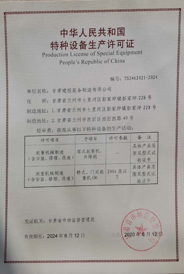甘肅建投裝備制造有限公司獲得特種設(shè)備生產(chǎn)許可證