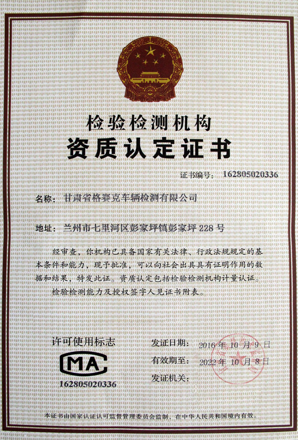 本報(bào)蘭州訊(通訊員 辛瑞德)近日,蘭州市七里河區(qū)彭家坪國(guó)家級(jí)工業(yè)園區(qū)傳來(lái)好消息,甘肅省格賽克車輛檢測(cè)有限公司取得機(jī)動(dòng)車安全技術(shù)檢驗(yàn)機(jī)構(gòu)檢驗(yàn)資格許可證和檢驗(yàn)檢測(cè)機(jī)構(gòu)資質(zhì)認(rèn)定證書(shū)。
